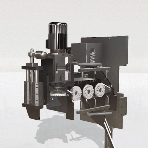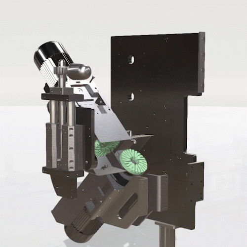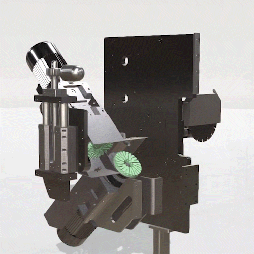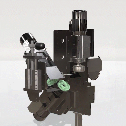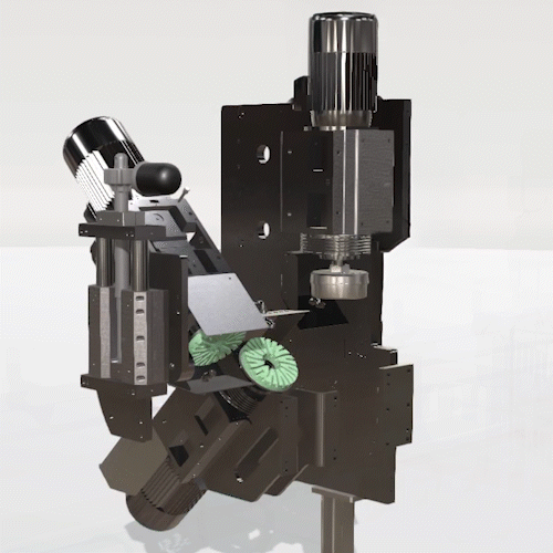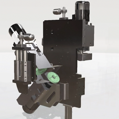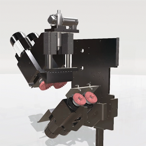 Each polishing head is driven by an electric motor (1.5 kW at 1500 rpm), while a pneumatic cylinder maintains constant pressure of the tool against the workpiece.
